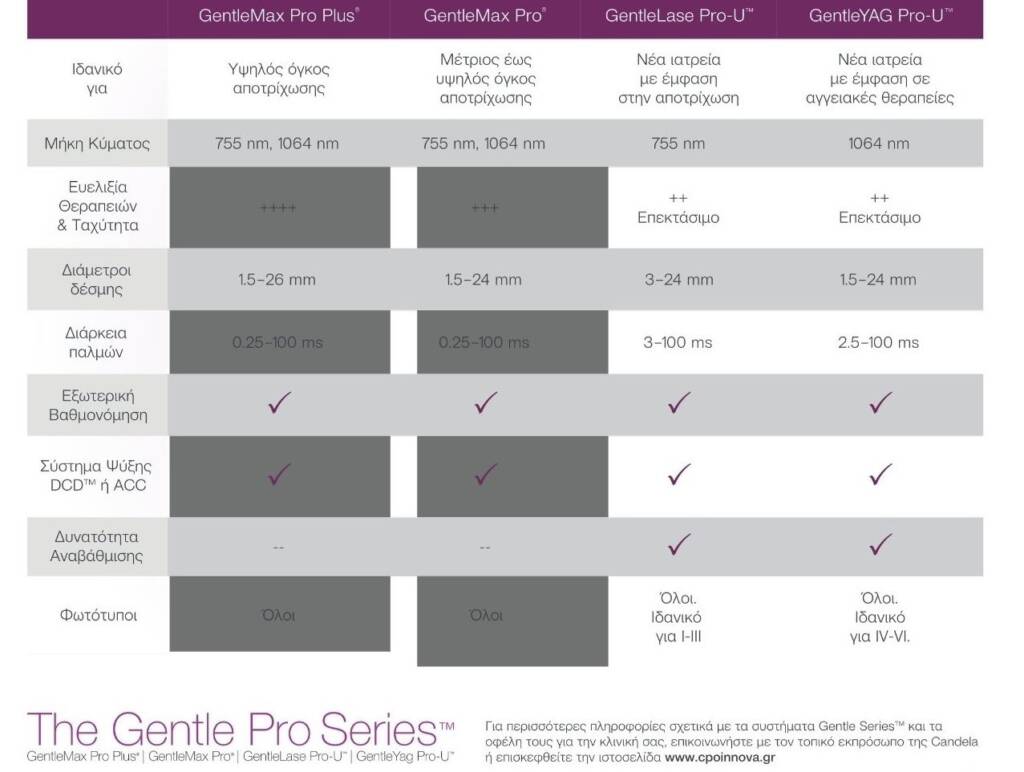 - GentleMax Pro Plus & GentleMax Pro: Η κορυφαία πλατφόρμα που συνδυάζει δύο τύπους Laser (Alexandrite (755nm)& Nd:YAG(1064nm) για οριστική αποτρίχωση, αντιμετώπιση αγγειακών , μελαγχρωματικών βλαβών, ονυχομυκητίασης και ανάπλαση σε κάθε φωτότυπο δέρματος.